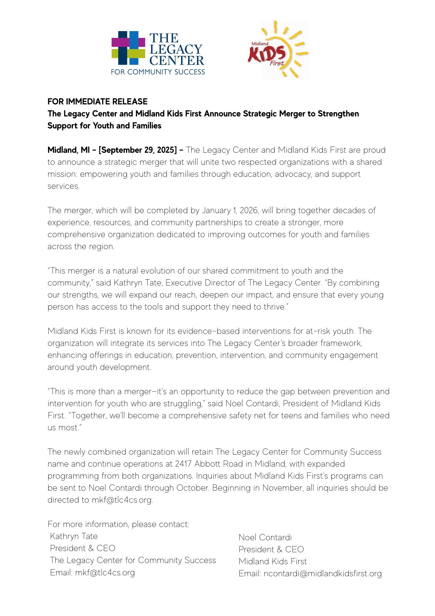The Legacy Center and Midland Kids First Merger